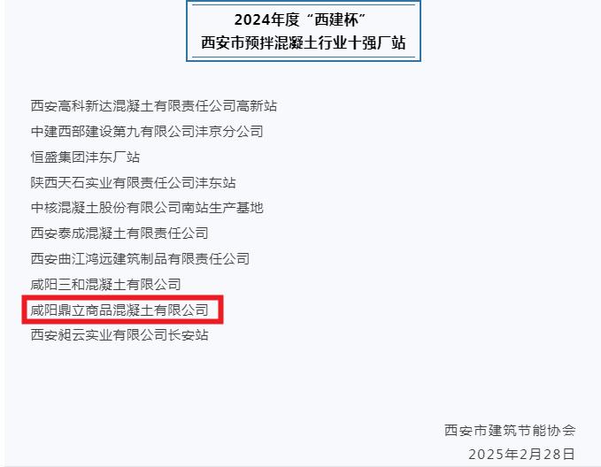 祝賀我公司榮獲2024年度“西建杯” 西安市預(yù)拌混凝土行業(yè)十強(qiáng)廠站榮譽(yù)稱號